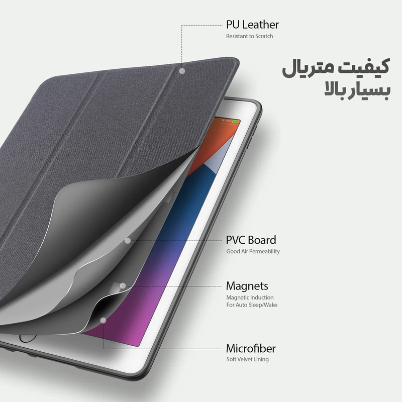 کیف مدل Domo محصول جدید مناسب برای تبلت Apple iPad 7 / 8 / 9 10.2 inch می باشد. این کیف یک محافظ کامل برای این تبلت می باشد. که علاوه بر زیبایی مقاومت و استحکام بسیار بالایی در برابر ضربه و زمین خوردن دارد. در این کیف بصورت هوشمند می باشد که با باز و بسته کردن در صفحه نمایش بصورت خودکار خاموش و روشن می شود. همچنین استند چند حالته این کیف امکان قرار گرفتن تبلت در زوایای مختلف را فراهم می کند.